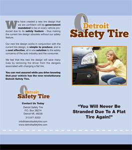 Thank you for visiting our site and for your interest in the Detroit Safety TireTM. The Detroit Safety TireTM is a revolutionary tire design created by Detroit firefighter Mr. Jackson. Being a first responder for the fire department, Jackson knows the importance of tire safety on the road and has witnessed many dire situations that have stemmed from blow-outs and flat tires. Knowing that this situation needed to be addressed, Jackson invented the Detroit Safety TireTM to address this critical safety issue. The Detroit Safety TireTM is the revolutionary answer that works in conjunction with the current tire design but includes a safety feature that will save many lives by removing the driver from the dangers associated with changing a flat tire.